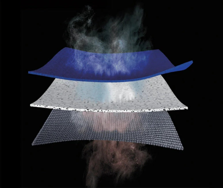 Dryhunt® provides direct air transmission through its nanoporous structure. As you move, sweat vaporizes and passes instantly through 0.5 micron nanopores - not through slow chemical diffusion. A vaporized sweat molecule measures just 0.000275 microns and easily passes through, resulting in 32,000 g/m²/24h breathability - hundreds of times more efficient than GORE-TEX. This keeps you dry during intense climbs and comfortable during stationary sits, because air flows continuously through the membrane regardless of activity level.
